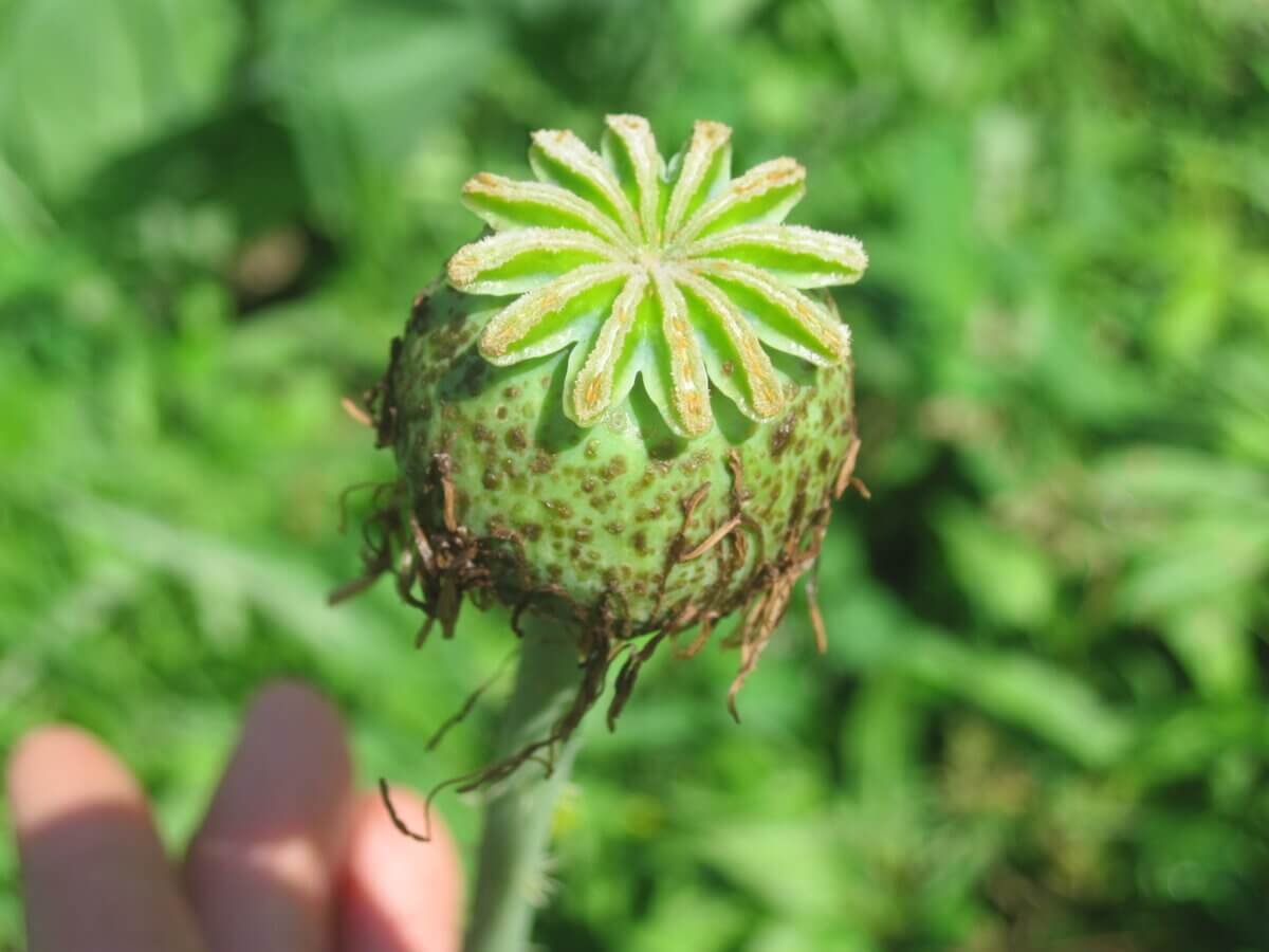 Opium poppy seed capsule, not quite ripe. Photo courtesy of Wren Everett.