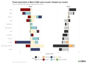 New analysis from the Centre for Research on Energy and Clean Air (CREA) shows that global fossil fuel power generation fell by about 1% in March, the first full month after the disruption began. What stands out is not just the drop, but what replaced it. Solar and wind grew fast enough to fully cover the gap left by fossil fuels.