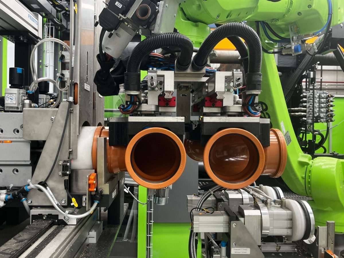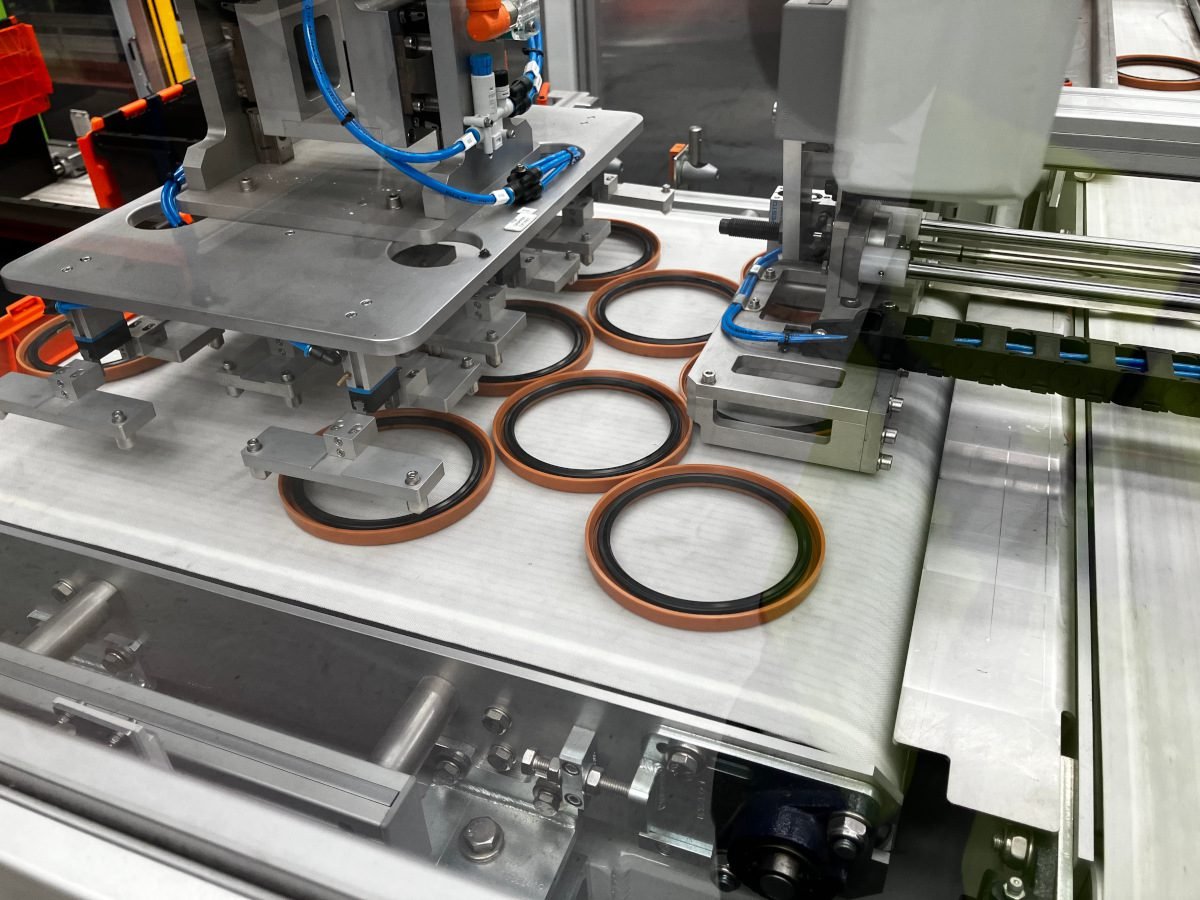 So, an example is 110mm pipe seals. Thousands are produced and the advanced visual inspection system checks every single one. Then a robot takes this seal and assembles it to the fitting. It then pressurises the fitting for a few seconds to ensure leak-tightness. Any rejects are fed back into the recycled product chain so waste is absolutely minimal.