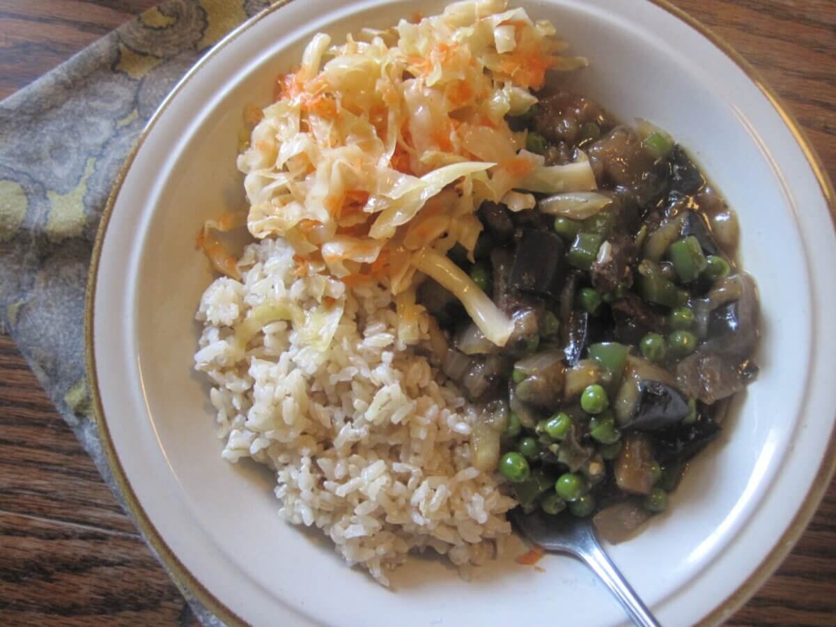 This simple, weekday dish uses a small amount of ground turkey to add flavor and richness to the stir-fry. The eggplant takes up the role of the “meat.” The lacto-fermented sauerkraut truly elevates the result.
