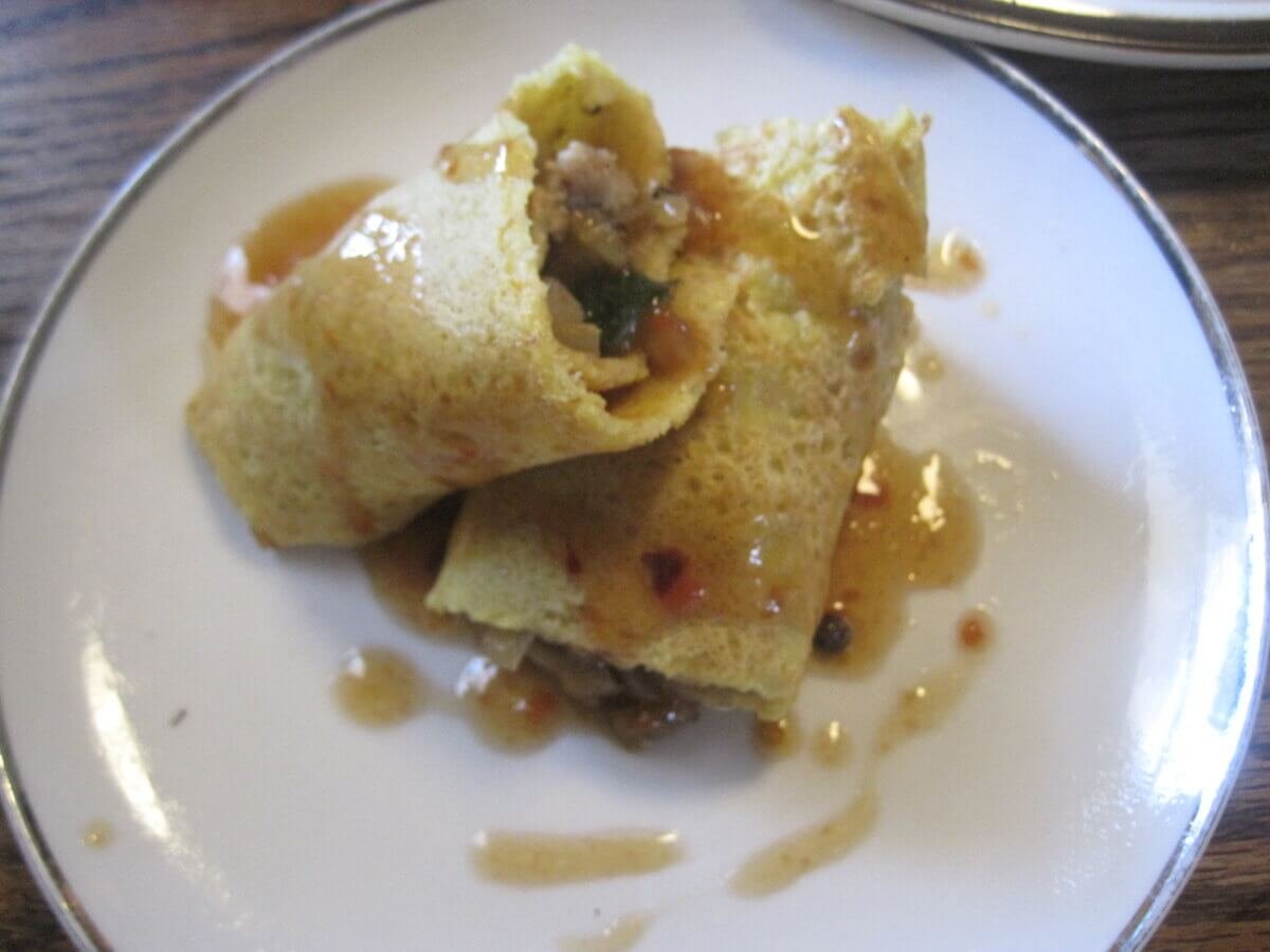- Assemble each crepe by placing a spoon of filling in the middle, rolling tightly, cutting in half (on an angle if you’re feeling fancy), and finishing with a drizzle of the sauce.