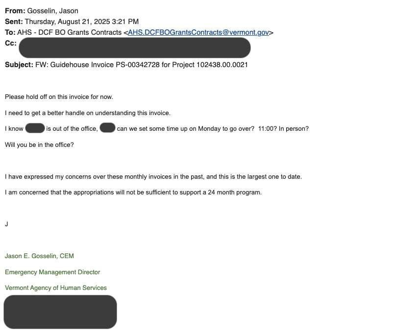 Vermont had been working with Guidehouse since 2020, when the global COVID-19 pandemic took hold. The state competitively bid and signed a five-year master contract with Guidehouse that let any of its agencies issue a “task order” for services from the company, without having to seek bids again. While the bulk of the work seems to have stayed in the COVID realm, the governor told reporters in 2024 that the company was also helping to “augment” the state’s flood response effort.