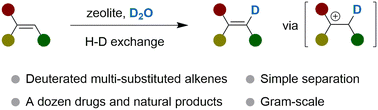 We report an efficient zeolite-catalyzed hydrogen isotope exchange reaction of multisubstituted olefins via reversible addition of protons to alkenes in D2O, affording deuterated drugs and natural products through a simple separation operation.