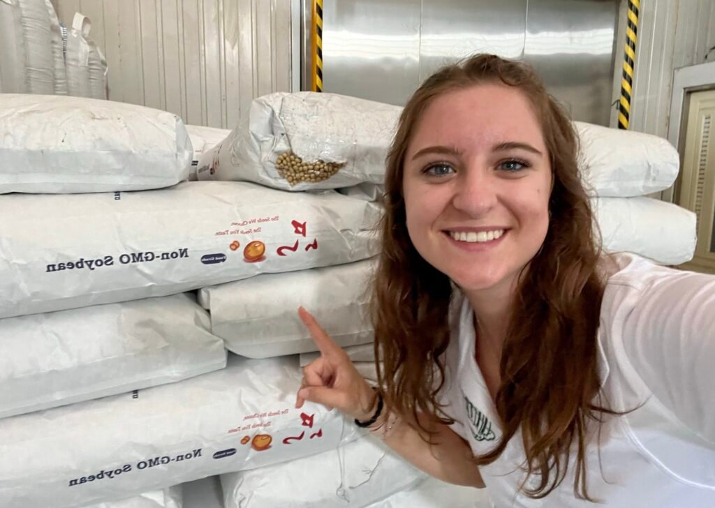 Meghan O’Reilly of Parkman, Ohio, visits a warehouse in Taiwan filled with USA and Canadian food grade soybeans to be made into tofu.