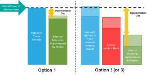 Drawing from personal experience, particularly in waste management planning, it seems reasonable to assume that there may be an implementation gap. The concern here is that the instrument’s objectives might be compromised if, in addition to such a gap between ‘intent’ and ‘achievement’, the ambition underpinning the intent is also uncertain. Opting for Option 2 (or 3, where relevant) as the basis for the agreed measures could lead to several challenges: