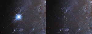Many thousands of bright, explosive looking stars speckle the screen. The smallest ones are white pinpoints, strewn across the screen like spilled salt. Larger ones are yellow and bluish white and they have spiky outer edges like sea urchins.
