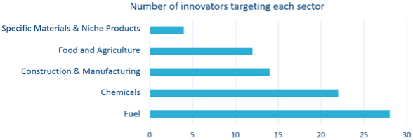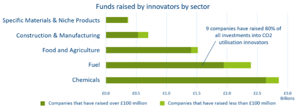 A similar picture is evident when examining the funds raised by innovators in each sector. However, the funding landscape has been dominated by 9 companies, together raising £3.5 billion of the £4.4 billion identified, many of whom have now grown in size enough to operate in two or three sectors. This exacerbates the double counting issue, but it reinforces the conclusion that the chemical and fuel sectors remain the most targeted.