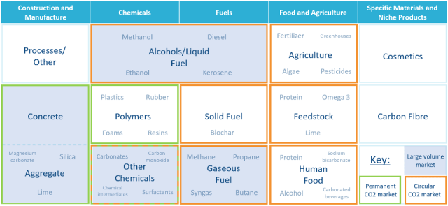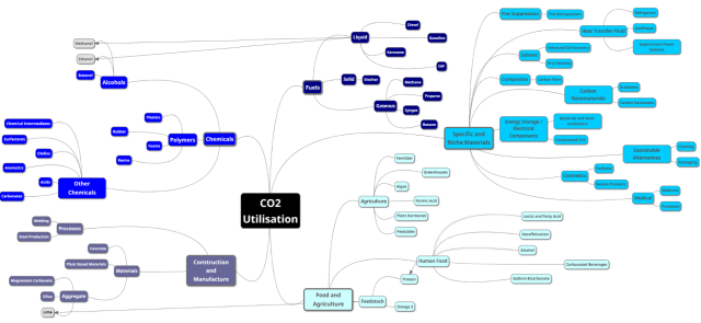 This diagram displays two points: firstly, that there are four main categories of uses (construction and manufacture, chemicals, fuels, food and agriculture), and a longer list of other uses, which have succinctly been named specific materials and niche products. Secondly that there are a lot of potential uses. However, just because there is plenty that we could do with CO2, this is not necessarily what we should do.