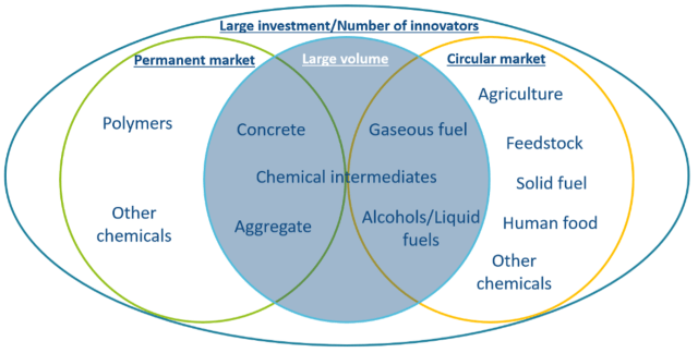 A quick review of the nature of each market allows an easy proxy for a full life cycle analysis to be produced. Is the end use of the converted CO2 permanent or circular? This can be seen overlayed on the landscape map below, with permanent markets obviously preferred over circular ones (markets with no overlay were not considered to be a priority). Using external analyses, a high pace assessment of sector volumes can be determined. Concrete/aggregate and fuels consistently appear with the largest market projects, with certain chemical use cases also occasionally mentioned. It is of course worth highlighting that these projections remain cautious of the extent to which captured CO2 based products will penetrate these markets, noting that it will be economic rather than technical barriers holding back the scale up of utilisation. Larger potential markets have been marked on the landscape map below by a shading of the use case.
