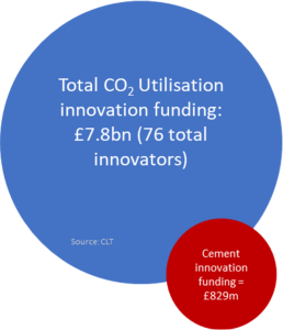 With all this in mind, cement/concrete innovation is unfortunately not getting much innovation activity and funding (globally and in the U.K.). The figure on the right (which is to scale) displays a rather striking comparison of venture capital funding for cement and concrete innovations versus CO2 utilisation innovation funding. Despite the fact that fuels and cement are the two largest sinks for CO2 utilisation, innovations seeking to transform cement and concrete have received roughly 10% of VC funding versus innovations who aim to utilise captured CO2.