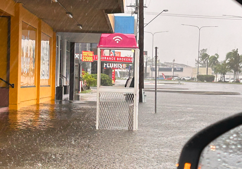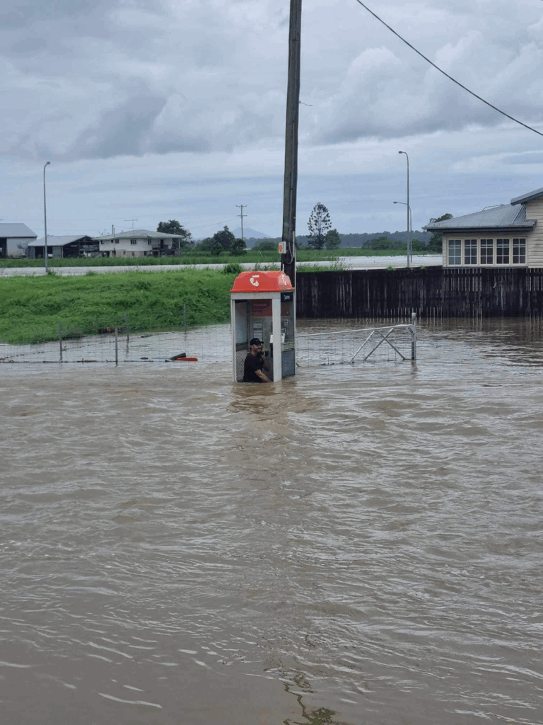 Flooding in Cairns surrounding the public phone. Image: Telstra
