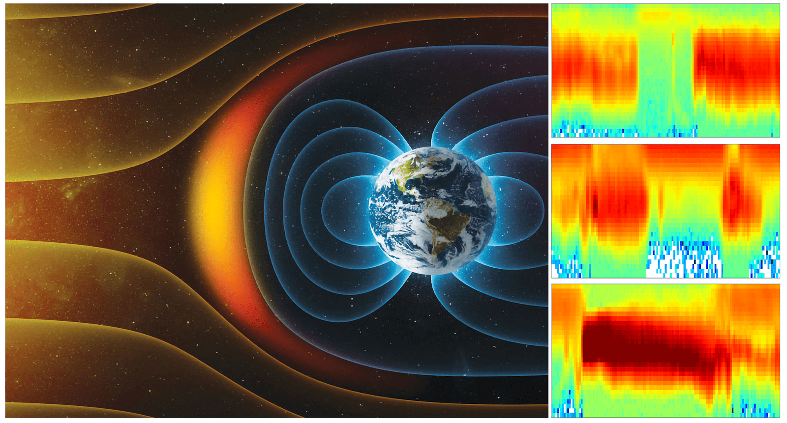 A combined image of Earth’s magnetic field and spacecraft data. On the left, a cartoon shows Earth’s magnetic field as blue lines arcing away from and then returning to the planet. The Sun’s charged particles are depicted as yellow lines running from the Sun towards Earth, then deflecting around the Earth’s magnetosphere, which is shown as an orange arc positioned between the Earth and the Sun. On the right are three example MMS data images such as those volunteers are asked to classify.