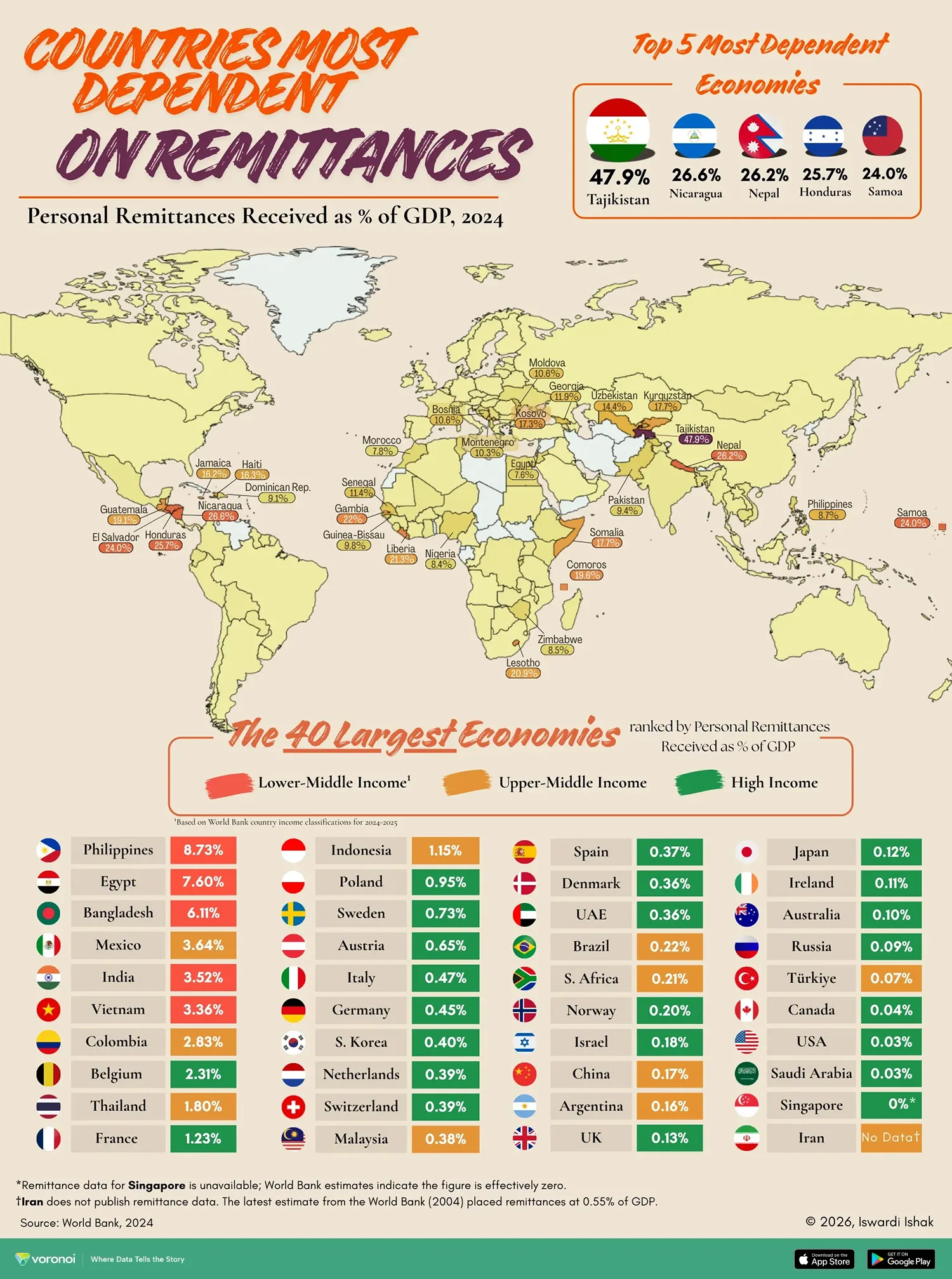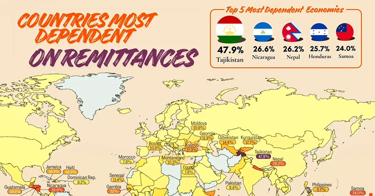 - By comparison, the global average is just 0.82%, showing how concentrated remittance dependence is.