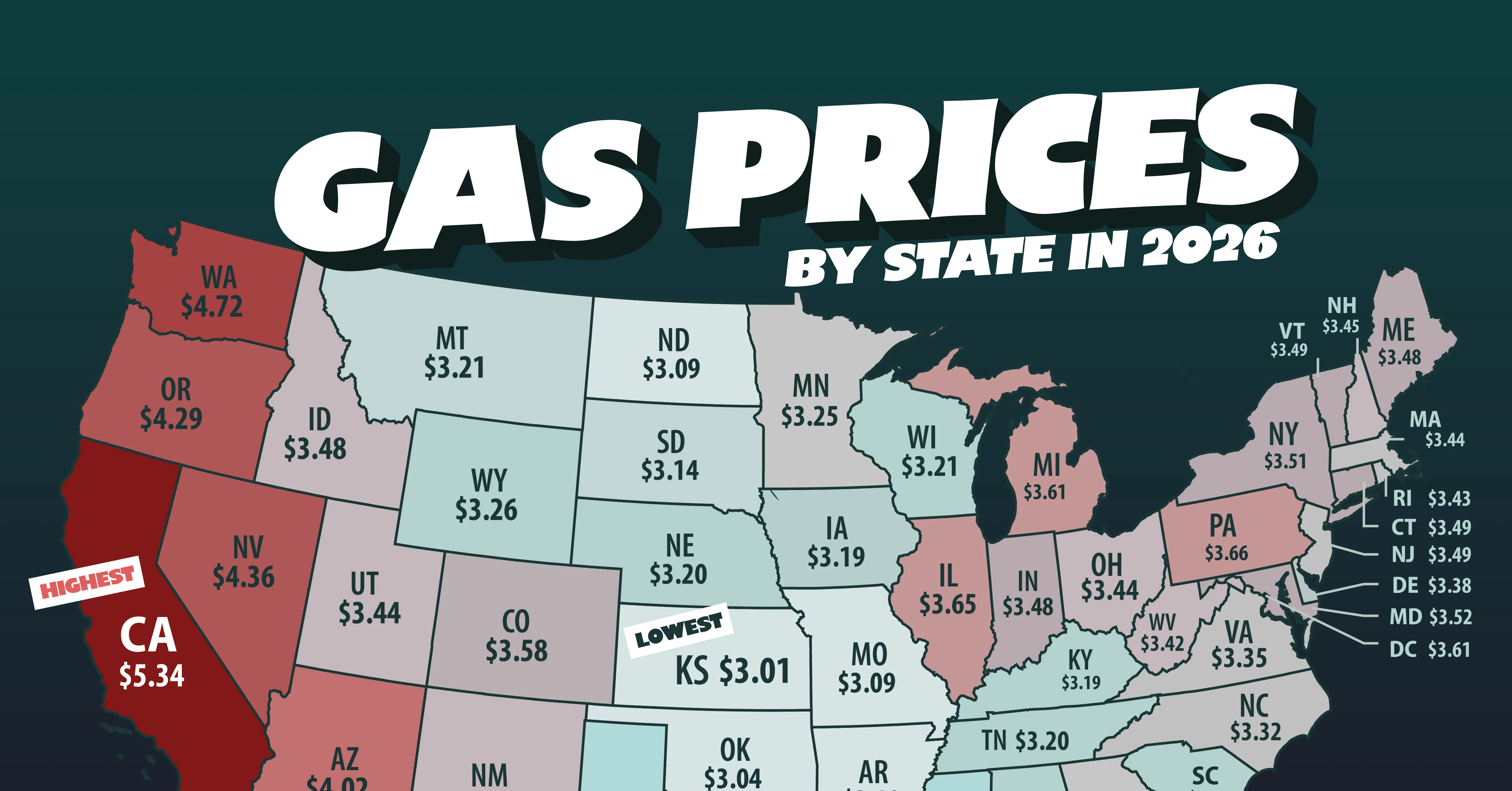 At the other end of the spectrum, Kansas has the lowest average price at $3.01 per gallon. Oklahoma ($3.04), Missouri ($3.09), and North Dakota ($3.09) are also among the cheapest markets.