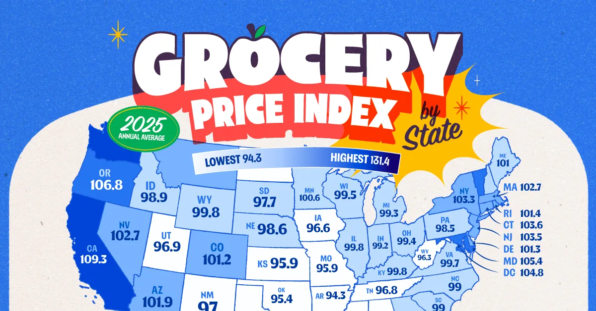 - Grocery prices vary by nearly 40% across U.S. states based on 2025 averages.