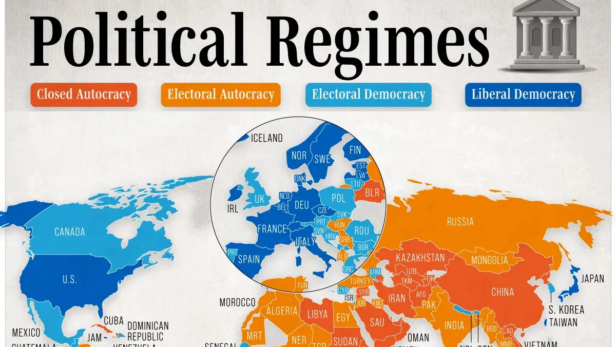 The map above classifies every country into one of four political systems: closed autocracy, electoral autocracy, electoral democracy, or liberal democracy.