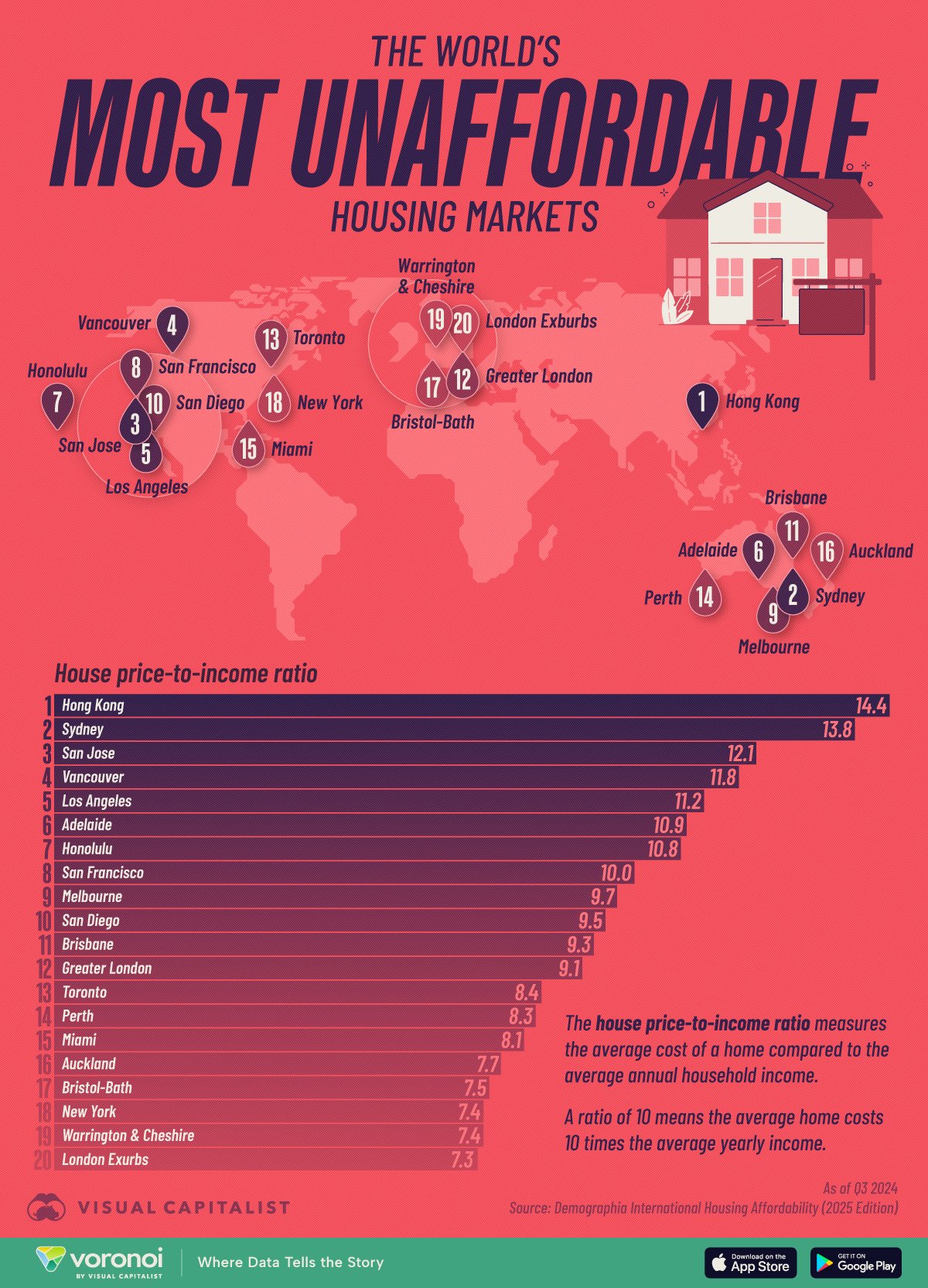Hong Kong tops the global list with a staggering house price-to-income ratio of 14.4. This means the typical home costs more than 14 years worth of household income.