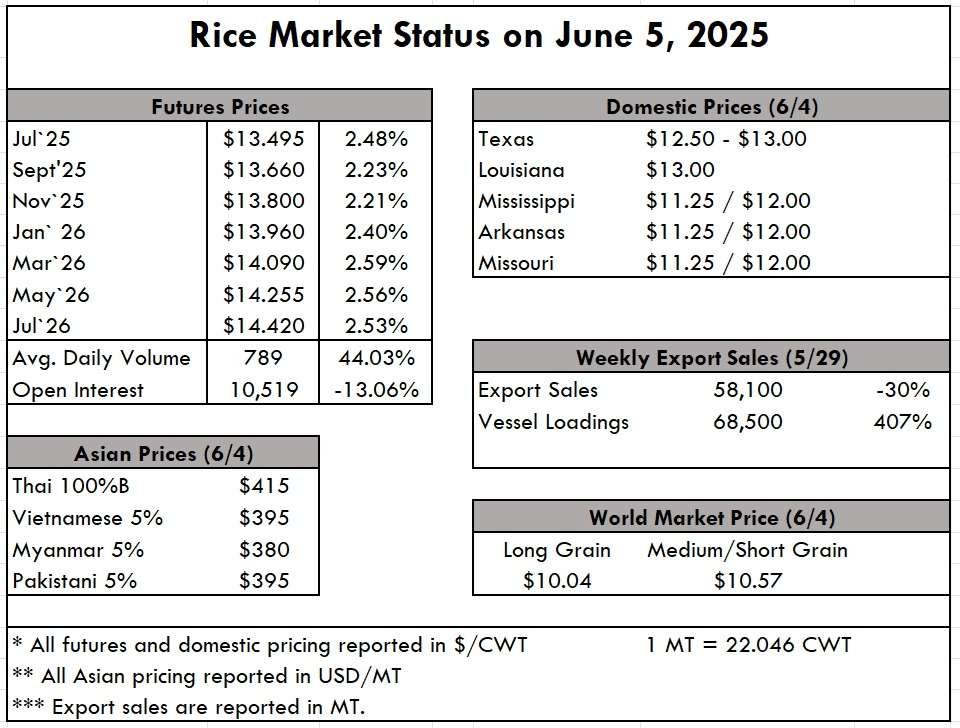So with planting and emergence largely behind us, we turn our sights more directly to crop condition across the rice-producing states. The good news is that we are 75% in the Good to Excellent condition this year, compared to 77% last year. It is still too early to make any prognostications, but not having any significant weather events early on is always a plus. That being said, weather has caused an obvious reduction in the concentrated area of long grain in northeast Arkansas, with an estimated 250,000 acres going to preventive planting. Keep your eye on the weather throughout the northern rice delta as the forecast calls for wet, stormy conditions. Prices on the ground here in the U.S. for any scant amounts of old crop are being reported with Texas at $12.50-$13. Louisiana is showing $13/cwt, while Mississippi, Arkansas, and Missouri are reporting in at $11.25-$12/cwt. Many of the mills are entering a summer slowdown, while others are busy milling the Iraq business so desperately needed to keep liquidity present. Check out June’s FAO Rice Update here. In Asia, prices are still dismal, but at least steady. Thailand and Vietnam are both competing in the $400 pmt +/- $5, while India is sub-$400 at $390 pmt this week. Business is relatively steady in the Far East, with many destinations ordering at ease because of the low prices with no threat of an increase on the horizon. The weekly USDA Export Sales report shows net sales of 58,100 MT this week, down 31% from the previous week, but up 17% from the prior 4-week average. Increases primarily for South Korea (22,200 MT), unknown destinations (17,500 MT), Saudi Arabia (9,000 MT), Haiti (8,000 MT), and Japan (1,000 MT) were offset by reductions for Guatemala (1,200 MT). Exports of 68,500 MT were up a whopping 407% from the previous week and up 52% from the prior 4-week average. |
