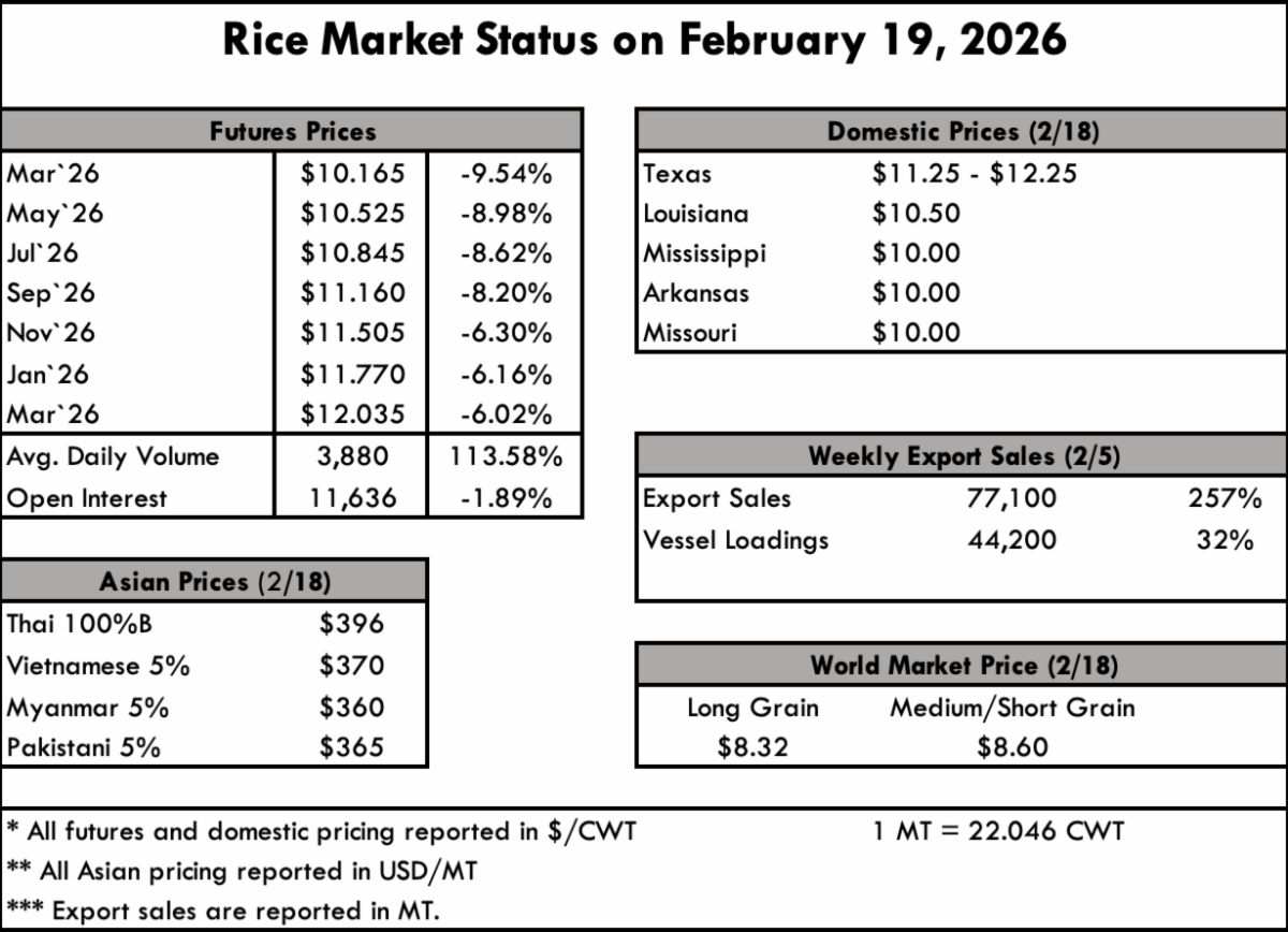From a global perspective from the WASDE, global rice production is slightly higher from last month, primarily due to an increase for Cambodia. Global trade is virtually unchanged with increases to Burma, China, and Tanzania exports nearly offsetting a reduction for Thailand and the United States. Global consumption is down on a reduction to Burma, more than offsetting increases for China, Japan, United Arab Emirates, and Cote d’Ivoire. Global stocks are forecast higher due to Thailand, Burma, and Cambodia.