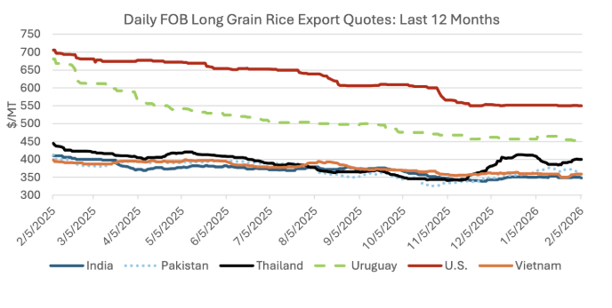 Since the January WASDE, global export quotes decreased aside from Thailand. U.S. quotes dropped $2 to $550/ton on continued weak sales to Latin America. Uruguayan quotes declined $13 to $453/ton as customers wait for the harvest of the new crop. Indian quotes are down $3 to $351/ton. Vietnamese quotes decreased $1 to $359/ton despite sales to the Philippines resuming following the expiration of the temporary rice import ban. Pakistani quotes dropped $4 to $366/ton, reflecting reduced demand from core Middle East markets. Thai quotes were up $4 to $400/ton, on currency appreciation, and are the highest among major Asian exporters.