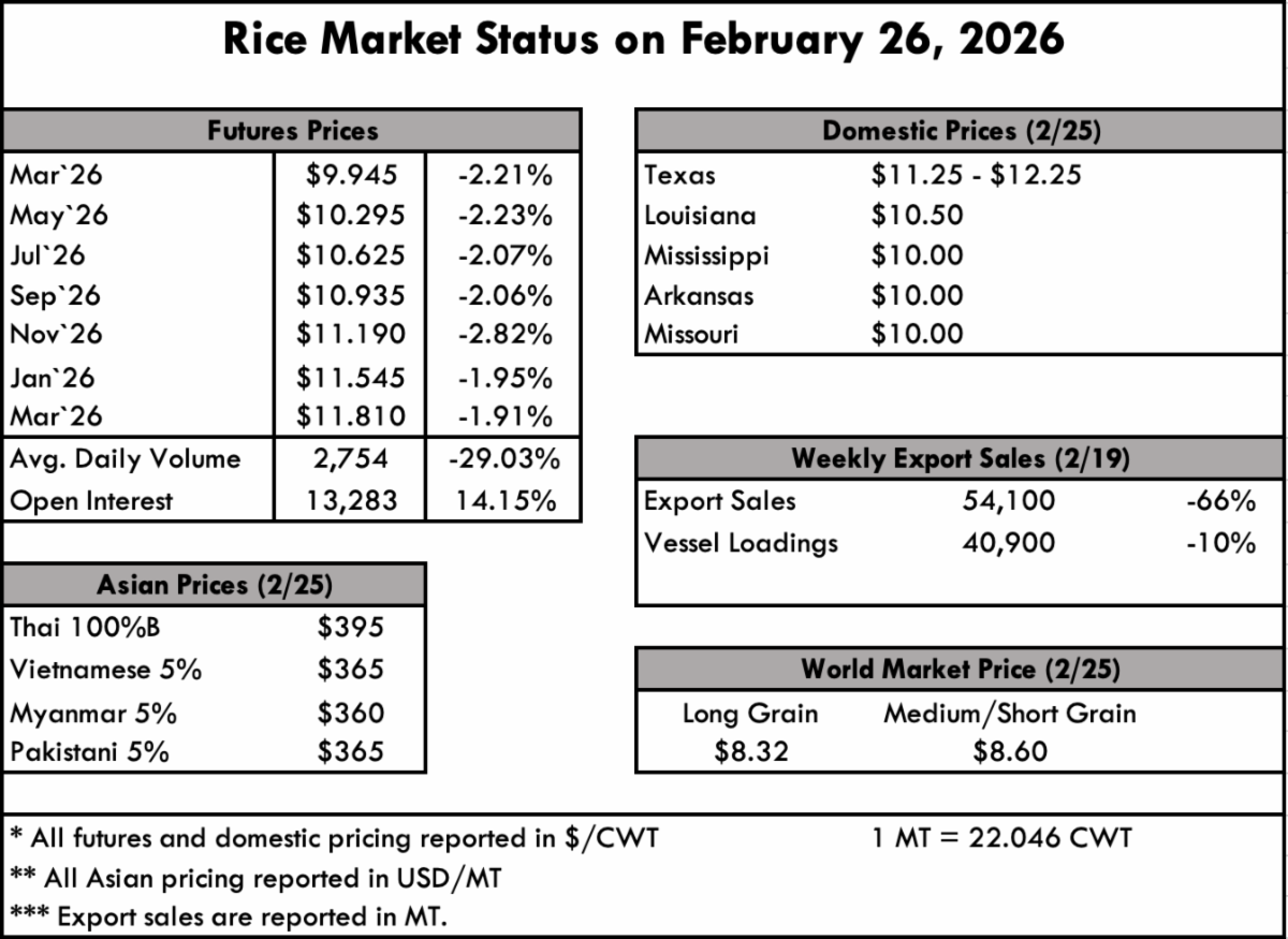 This week, the U.S. long-grain rice market remains cautious as the first seeds have gone in the ground in south Louisiana and likely somewhere along the Texas gulf coast. The carryover of 39 million cwt is like a wet blanket on the prices, with any producer holding physical rice unwilling to sell at current levels. While in many marketing cycles there are factors that can result in volatility, it is difficult to find any at the moment. Even with the anticipated acreage reduction of at least 25% for long grain acres overall, increased prices remain an uphill battle given the global supply dynamic. We would caution anyone hoping to speculate on medium grain acres as well, as California is looking to have a crop at least as large as last year (525,000 acres) if not larger. Significant storms on the west coast in the past week have secured the snowpack and reservoir flows to ensure a full plant, unless there are late storms that will result in prevent plant. Acres in the south will already be committed by then, however, so we can’t recommend speculating on medium grain as a sound marketing strategy.