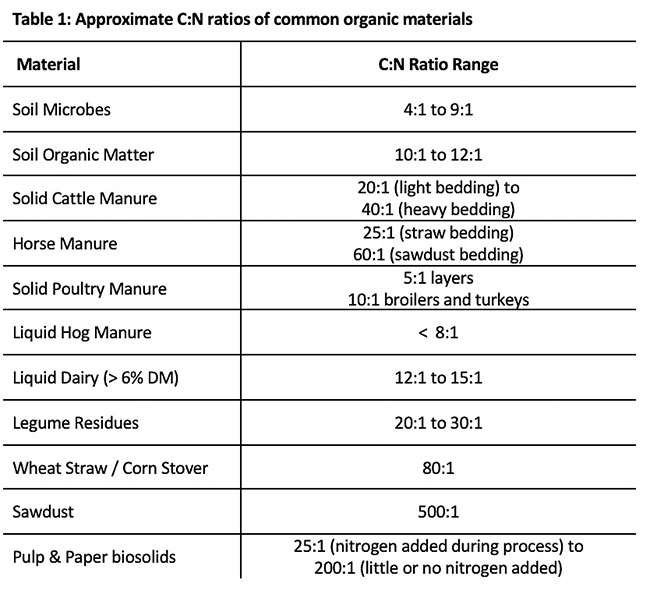 When manure is applied to a field, it adds both nutrients and organic matter to the soil. The carbon-to-nitrogen (C:N) ratio in a manure analysis indicates the proportion of organic carbon to total nitrogen in the material. Table 1 shows the approximate C:N ratio for common organic materials.