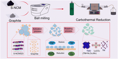 Ball milling spent cathode materials with graphite and H2O2 can reduce the temperature of the carbothermal reduction reaction and decrease graphite consumption, making it highly environmentally friendly.