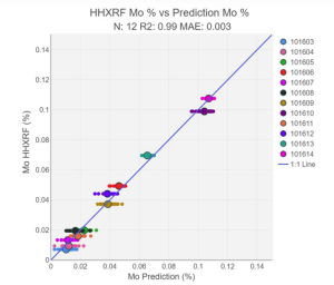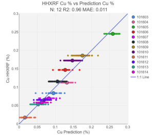 The two graphs below for amenability modelling results show the ability of MineSense XRF shovel-based sensors to delineate between higher and lower grade copper and molybdenum CuMo ore.