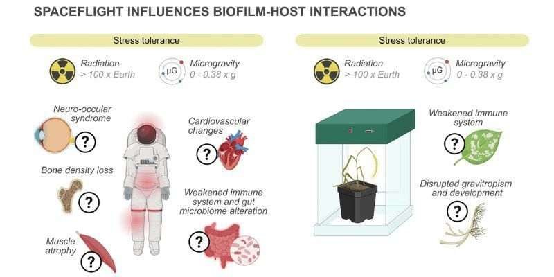 Biofilms support human and plant health on Earth. Spaceflight may disrupt these biofilm-host interactions, with implications for crew health and plant-based life support systems.