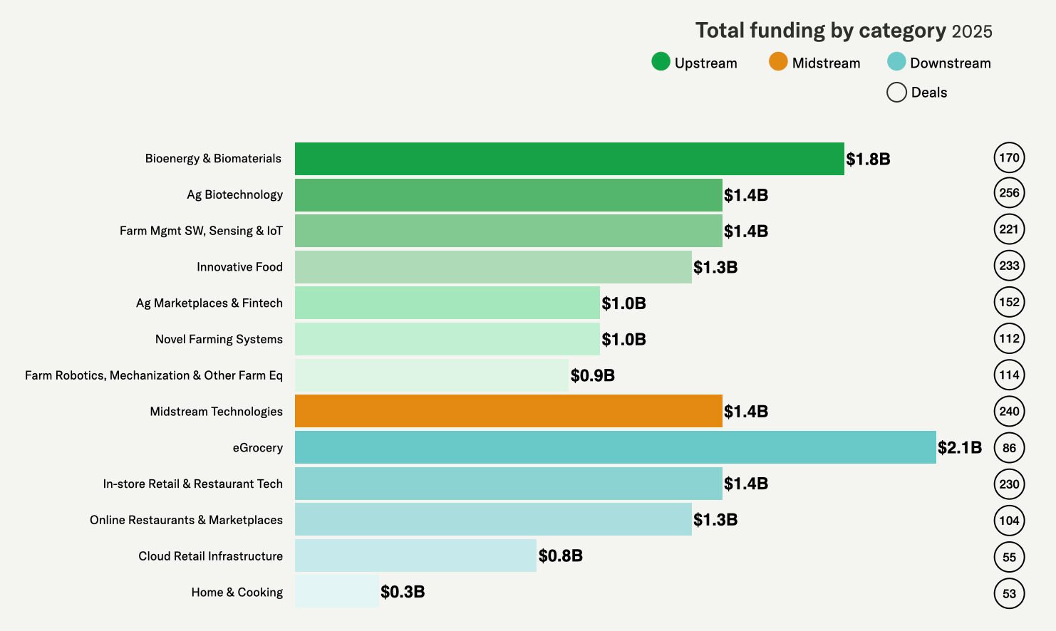Upstream startups—those working on farms and in food production—drew $9 billion in 2025, up 7% year over year. Downstream categories, dominated by eGrocery and food delivery, continued to shrink. Wonder’s $600 million Series D was the year’s largest deal. In 2021, it would have been a footnote.