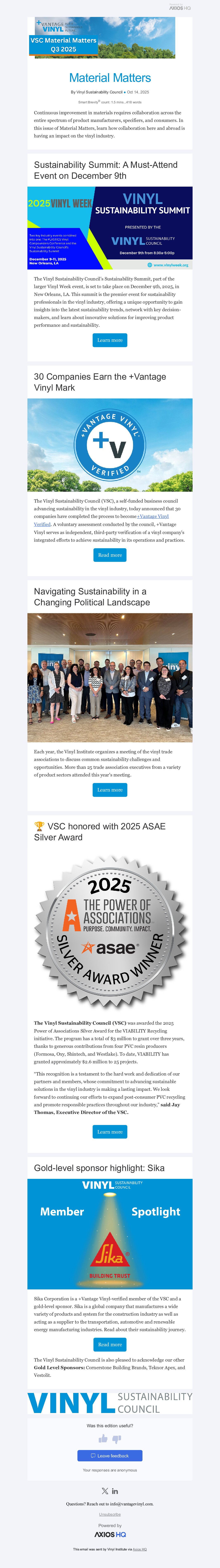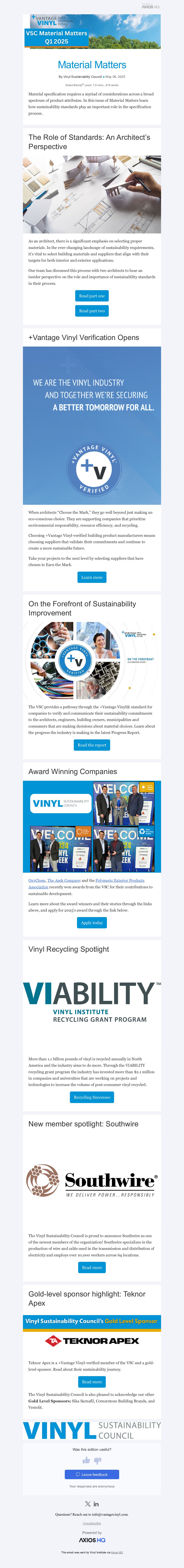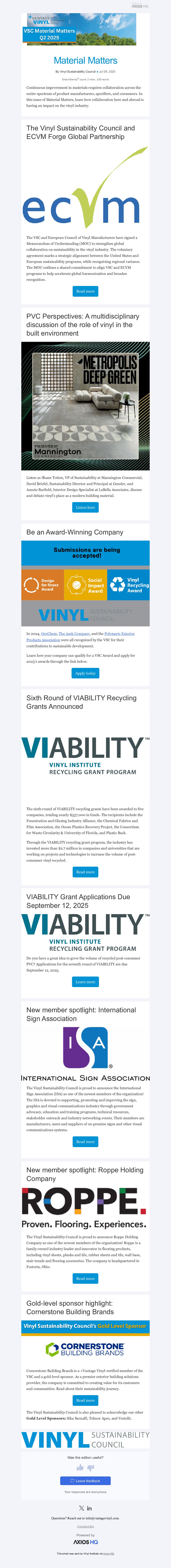 Also, check out the video series we’re conducting on VIABILITY! Our Executive Director Jay Thomas is travelling the country to interview the awarded organizations to learn more about their operation and how they aim to grow post-consumer vinyl recycling.