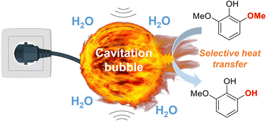 Using the O-demethylation of syringol as a model reaction, we investigated and clarified the reaction mechanism occurring at the cavitation bubble–water interface.