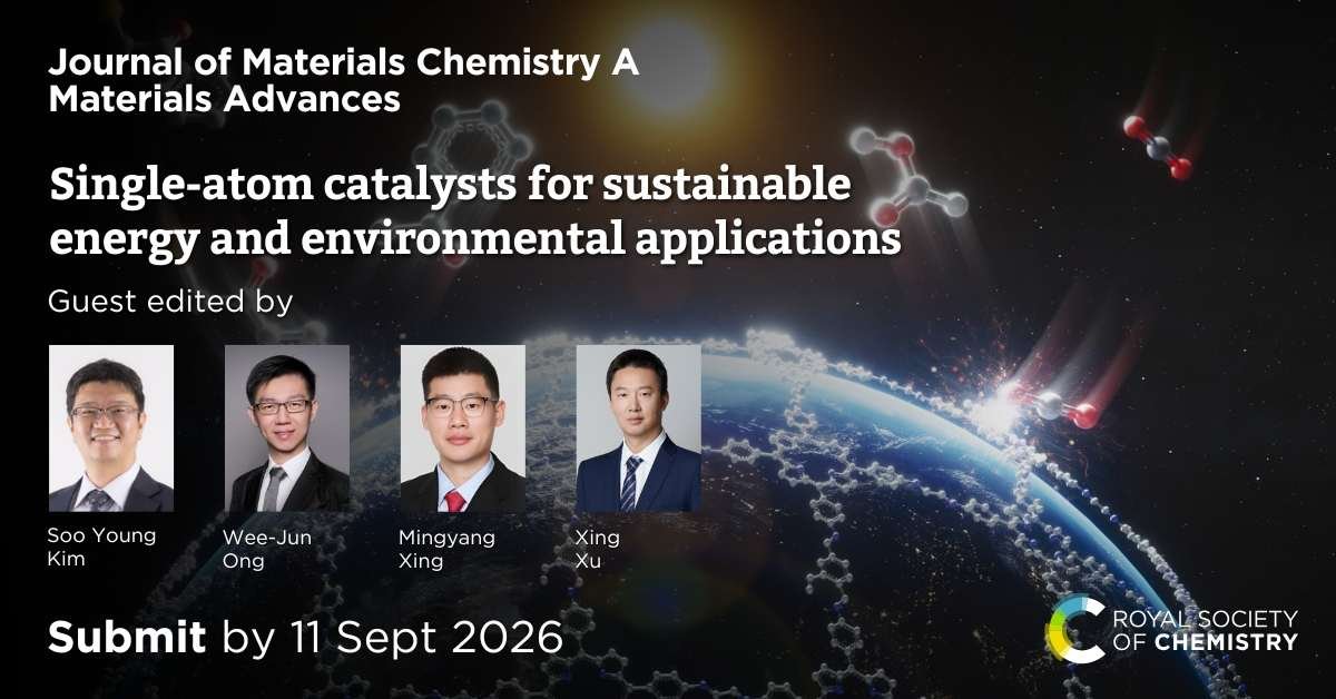 We are delighted to announce this open call for papers to contribute to a themed collection for Journal of Materials Chemistry A and Materials Advances on Single-Atom Catalysts for Sustainable Energy and Environmental Applications, guest edited by Soo Young Kim (Korea University, Republic of Korea), Wee-Jun Ong (Xiamen University Malaysia, Malaysia), Mingyang Xing (East China University of Science and Technology, China) and Xing Xu (Shandong University, China).