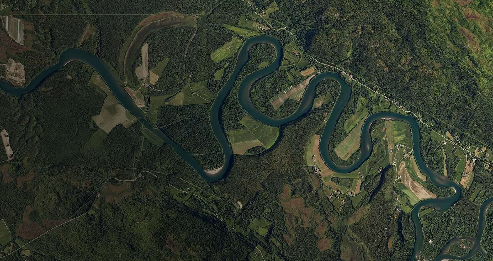 Aerial view showing green landscape directly below like that of a rural region seen from an air balloon, with a river winding through it, and squares or oblongs of different yellow, green and brown colours