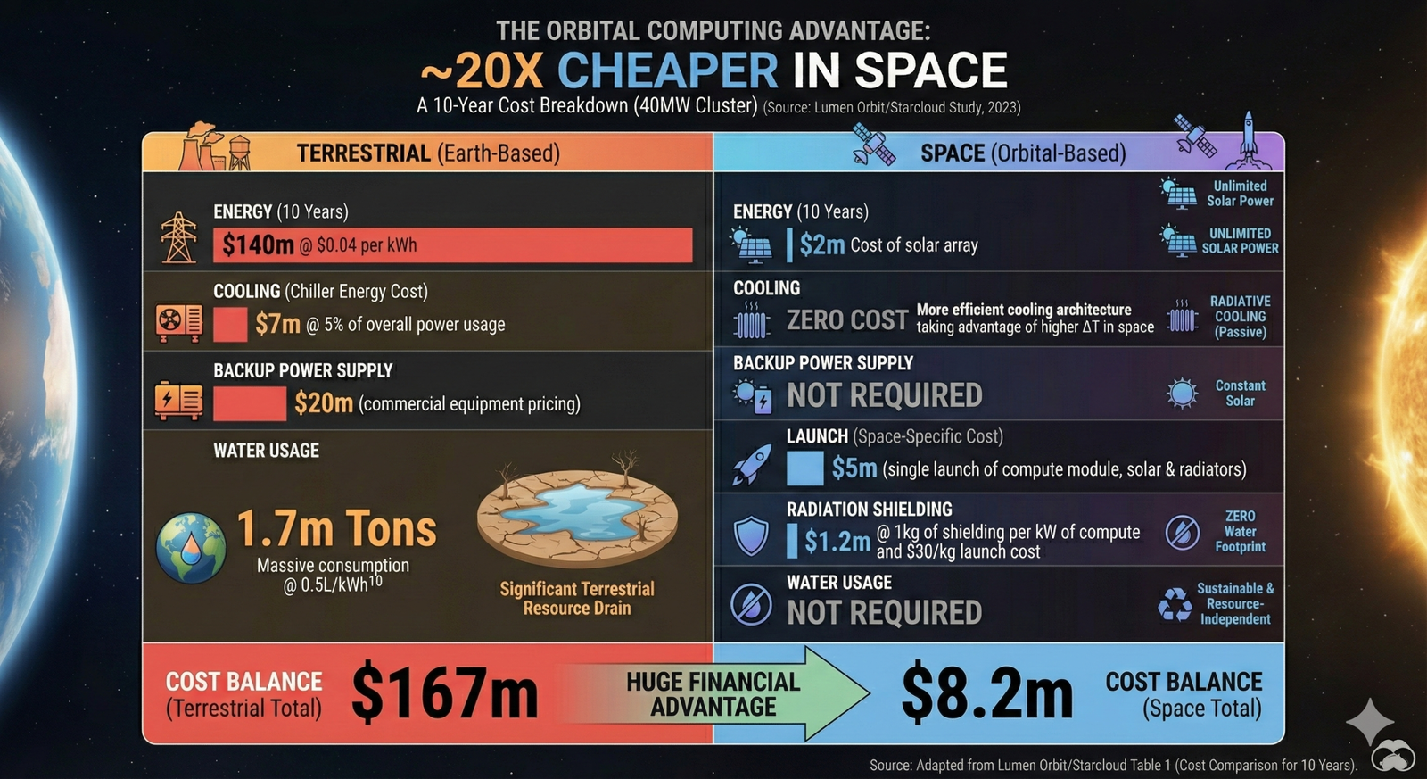 Based on the Lumen Orbit white paper, the cost comparison between orbital and terrestrial data centers is dramatic: