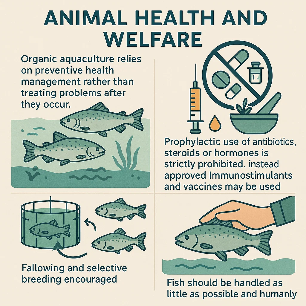 Organic aquaculture relies on preventive health management rather than treating problems after they occur. Farms maintain good water quality, adequate oxygen, and low stress so that fish build natural immunity.