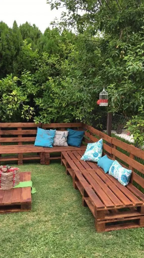 Soft outdoor cushions and weather-resistant pillows add both comfort and color. Neutral shades create a calm space, while brighter tones bring energy and personality to the patio. A light coat of wood stain or outdoor paint protects the wood from rain and sunlight while highlighting the natural grain of the pallets.