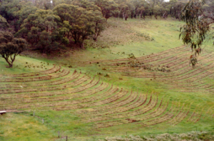 For this water conservation method, you will dig a series of ditches on grade across your slope. The idea here is to “catch” the water in these ditches as it flows down your land. The water then has a chance to soak into the ground in these ditches.