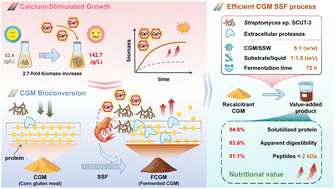 Calcium carbonate triggers Ca2+-associated responses to enhance Streptomyces sp. SCUT-3 growth, enabling efficient bioconversion of corn gluten meal into highly digestible proteins and bioactive peptides.