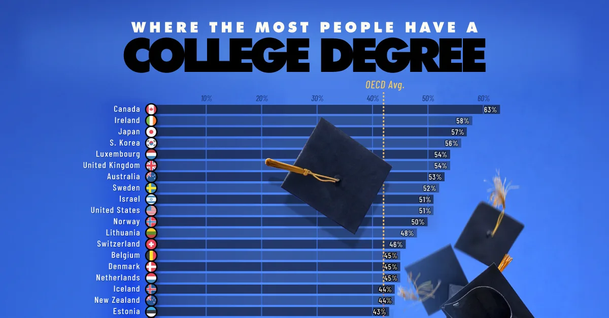 Canada tops the ranking at 63%, making it the only country where nearly two-thirds of adults hold a college degree. The United States is at 51%, just above the OECD average of 42%.