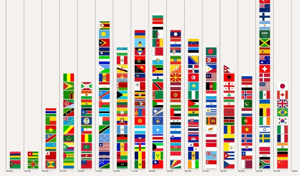 This visual shows results from FlagWhiz.com, a game that allows users to guess the correct country that corresponds to a given flag based on four multiple-choice options. Data is based on 511,581 guesses made from players all over the world.