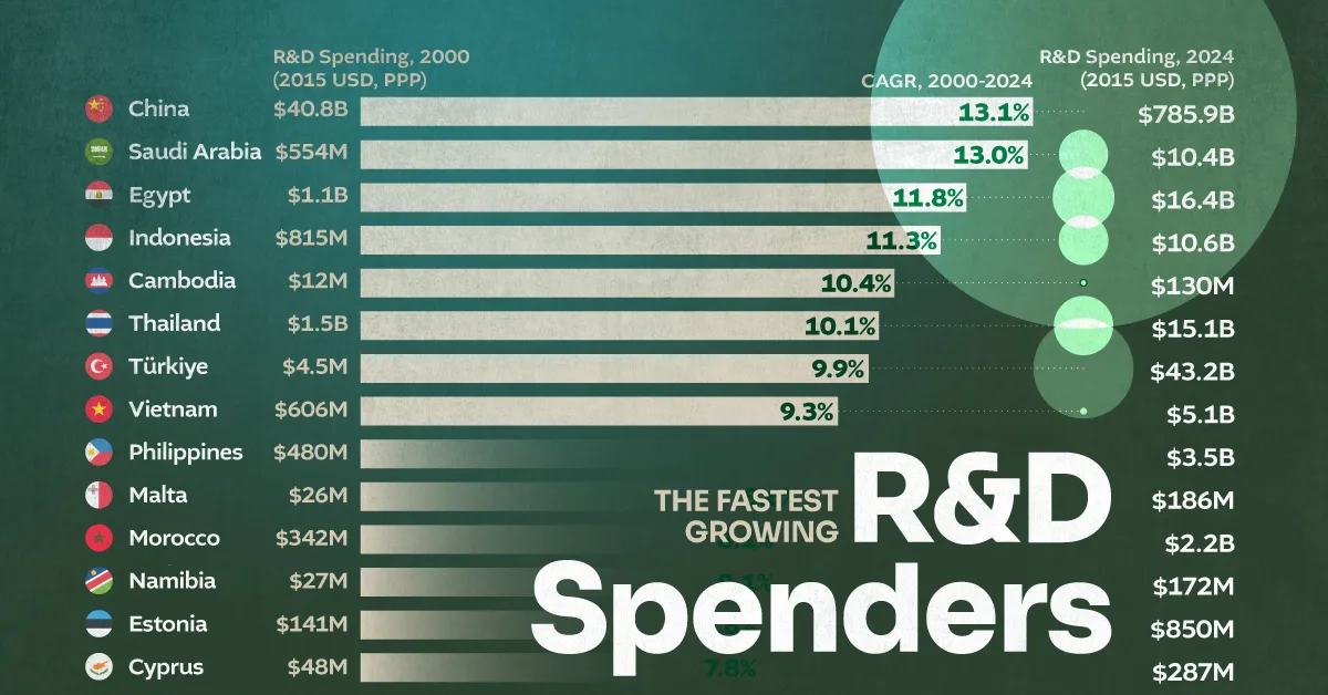 This visualization ranks the world’s fastest-growing R&D spenders based on the compound annual growth rate (CAGR) of gross R&D expenditure between 2000 and 2024, using data from the World Intellectual Property Organization (WIPO). All figures are in constant 2015 purchasing power parity (PPP)-adjusted U.S. dollars.