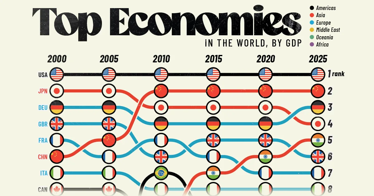 This graphic shows the top economies by GDP over the past quarter century, based on data from the International Monetary Fund.