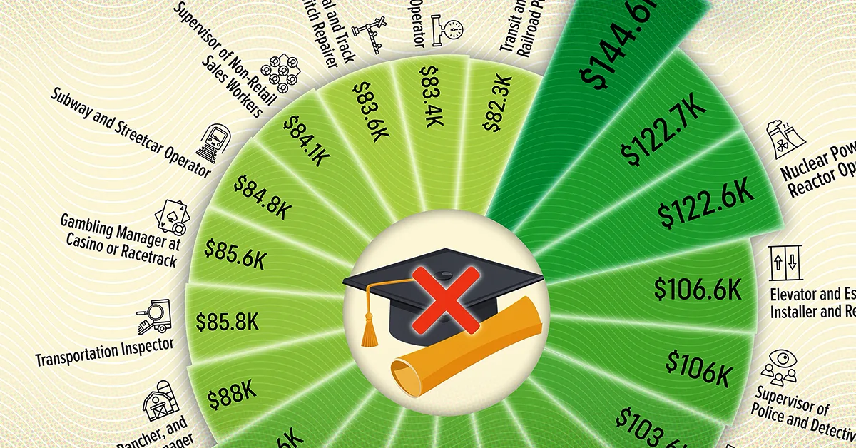 The visualization above, by Julie Peasley, breaks down the top 20 highest paying jobs that don’t require a college degree, from nuclear reactor operators to transportation managers.