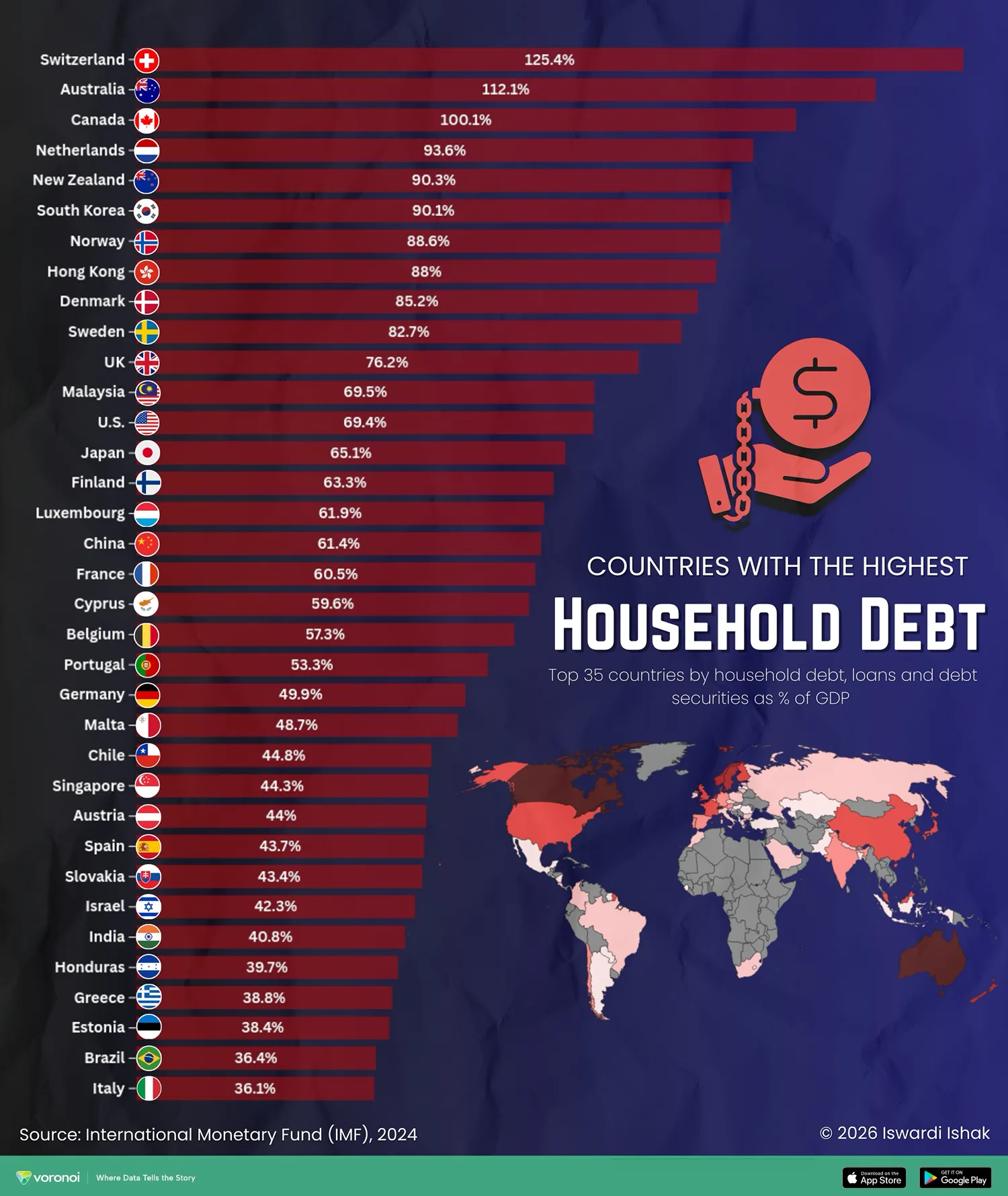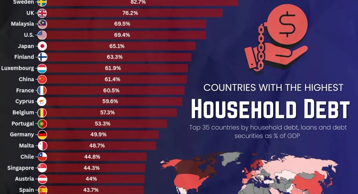 The International Monetary Fund (IMF) recently released data showing the countries with the highest levels of household debt, defined as loans and debt securities incurred by households, expressed as a percentage of GDP. The metric is often used as a barometer for financial risk and vulnerability at the household level.