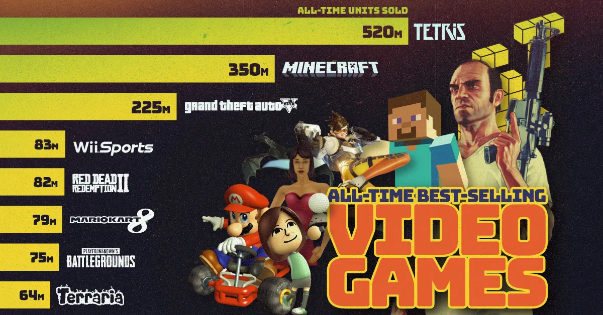 Despite gaming’s decades-long history, most of the top-selling titles were released after 2010. Franchises like Minecraft, Grand Theft Auto V, and Terraria reflect the shift toward digital distribution, live-service updates, and global player communities.