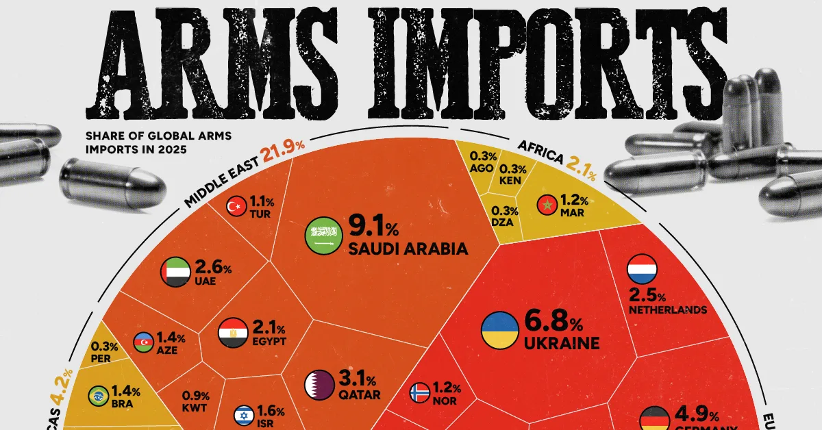This chart ranks the world’s largest arms importers in 2025, based on data from the SIPRI Arms Transfers Database (March 2026). It shows which nations are driving the surge in defense spending and where demand is accelerating fastest.