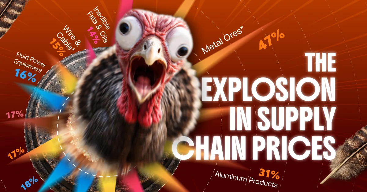 One standout: turkeys. Businesses saw wholesale prices rise by 70% in the last year, driven by bird flu outbreaks that reduced supply. Businesses using turkey as a core input, such as deli meat producers, frozen meal manufacturers, and pet food companies will be hit particularly hard.