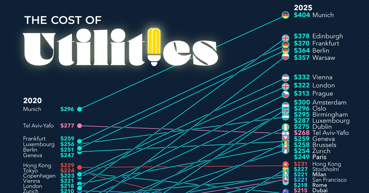 Stacked line chart showing the cost of utilities in major cities in 2025 and 2020.