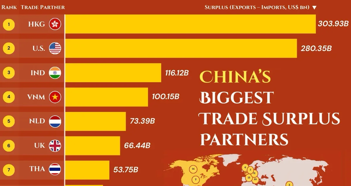 Close behind Hong Kong was the United States at $280 billion, continuing a long-standing trade imbalance. India and Vietnam, at over $100 billion each, underline China’s deepening trade ties in Asia.